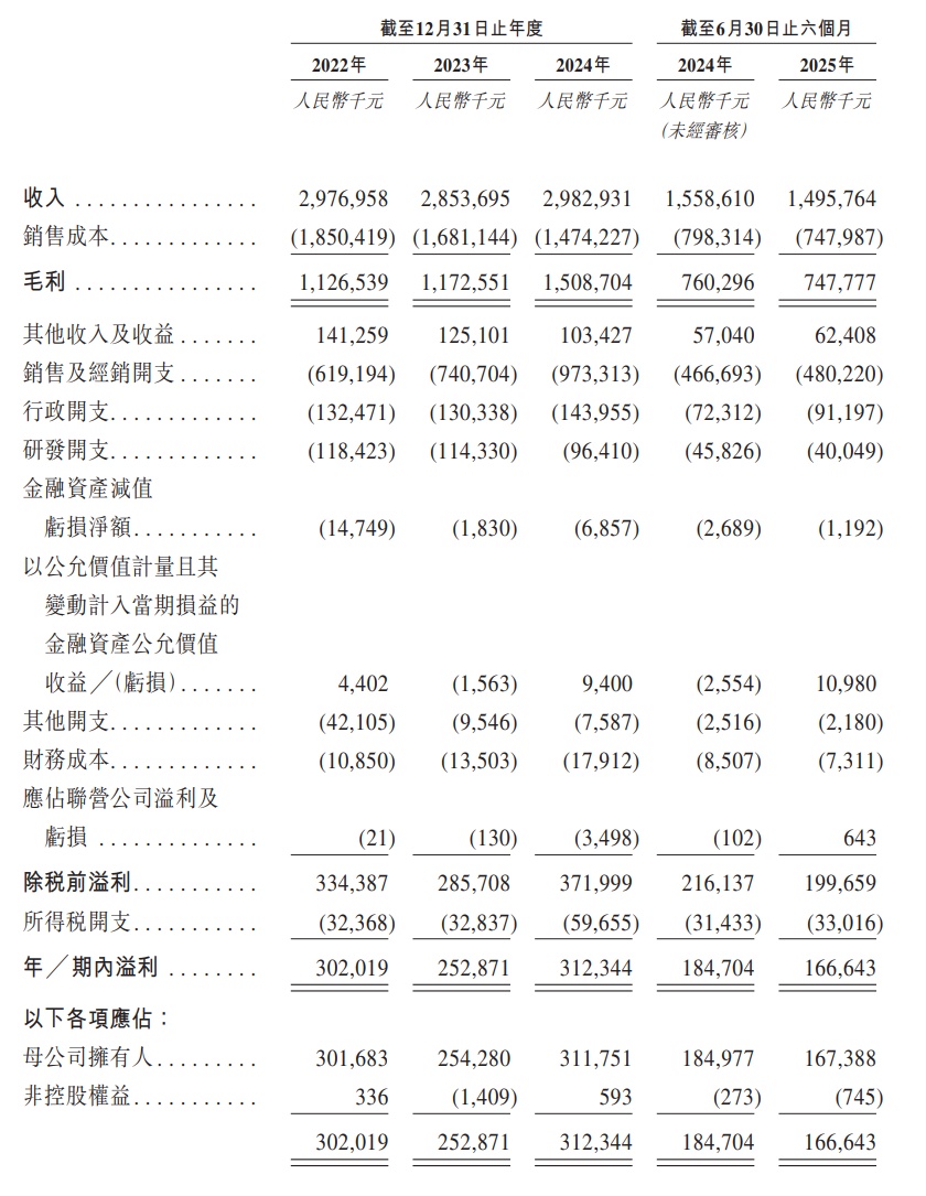 財務方面,于2022年度、2023年度、2024年度及2025年截至6月30日止6個月,可孚醫(yī)療實現(xiàn)收入分別約為29.77億元、28.54億元、29.83億元、14.96億元人民幣;同期,年內利潤分別為3.02億元、2.53億元、3.12億元、1.67億元人民幣。