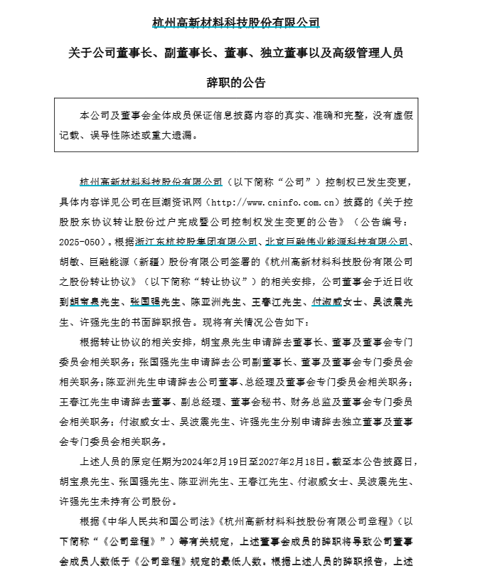 9月4日晚間,杭州高新(300478)發(fā)布公告稱,由于公司控制權(quán)已發(fā)生變更,胡寶泉、張國(guó)強(qiáng)、陳亞洲、王春江、付淑威、吳波震、許強(qiáng)等七人因股份轉(zhuǎn)讓協(xié)議安排申請(qǐng)辭去相關(guān)職務(wù)。