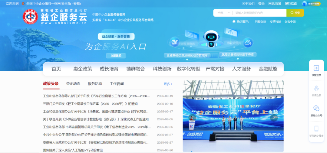 9月20日下午,由安徽省工業(yè)和信息化廳主辦,安徽省工信廳中小企業(yè)發(fā)展促進(jìn)中心承辦的2025世界制造業(yè)大會(huì)首場(chǎng)發(fā)布活動(dòng)——科大國(guó)創(chuàng)承建的“益企服務(wù)云”平臺(tái)(以下簡(jiǎn)稱“平臺(tái)”)上線發(fā)布儀式圓滿舉行,工業(yè)和信息化部中小企業(yè)局、中國(guó)中小企業(yè)發(fā)展促進(jìn)中心、安徽省工業(yè)和信息化廳、中國(guó)中小企業(yè)服務(wù)網(wǎng)等相關(guān)領(lǐng)導(dǎo)共同參與平臺(tái)啟動(dòng)環(huán)節(jié)。