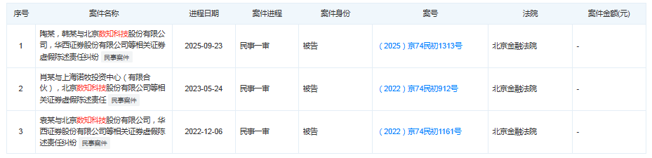 日前,據(jù)天眼查APP,華西證券(002926)新增一條司法案件,華西證券因數(shù)知科技證券虛假陳述一案,被投資者訴至法庭。9月23日,北京金融法院開庭審理了投資者訴數(shù)知科技及華西證券等機構(gòu)的證券虛假陳述責任糾紛案。