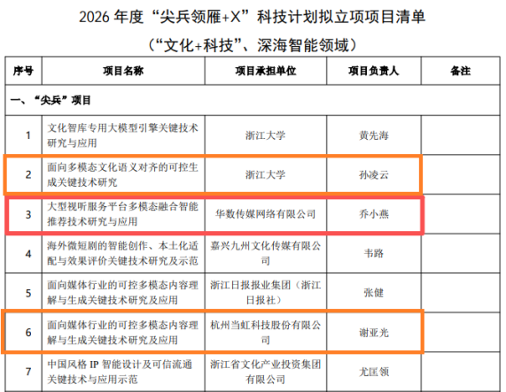 近日,浙江省科技廳發(fā)布了2026年度“尖兵領(lǐng)雁+X”科技計劃擬立項項目清單(“文化+科技”、深海智能領(lǐng)域)。其中由華數(shù)傳媒(000156)網(wǎng)絡(luò)有限公司首次牽頭承擔的“大型視聽服務(wù)平臺多模態(tài)融合智能推薦技術(shù)研究與應用”成功入選“尖兵”項目清單。同時,華數(shù)作為重要參與單位的2個“尖兵”項目也成功入選,分別是“面向多模態(tài)文化語義對齊的可控生成關(guān)鍵技術(shù)研究”和“面向媒體行業(yè)的可控多模態(tài)內(nèi)容理解與生成關(guān)鍵技術(shù)研究及應用”。