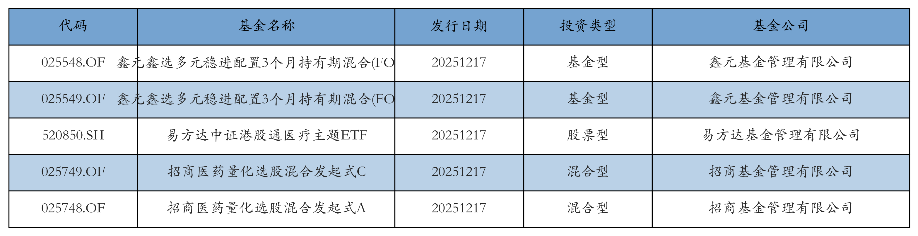 昨日有5只新基金發(fā)行,分別為:鑫元鑫選多元穩(wěn)進(jìn)配置3個月持有期混合(FOF)A、鑫元鑫選多元穩(wěn)進(jìn)配置3個月持有期混合(FOF)C、易方達(dá)中證港股通醫(yī)療主題ETF、招商醫(yī)藥量化選股混合發(fā)起式C、招商醫(yī)藥量化選股混合發(fā)起式A,詳情見下表: